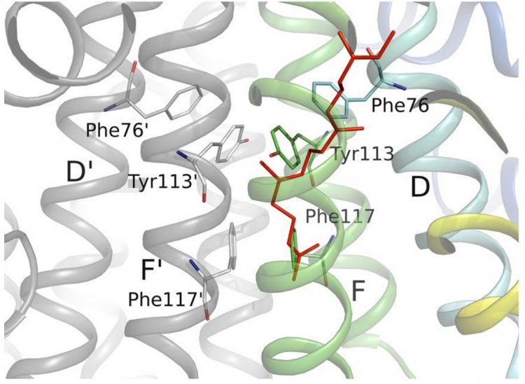 Область центральной гидрофобной щели белка GACE1337. Аминокислотные остатки Phe76, Tyr113 и Phe117, принадлежащие двум одинаковым субединицам, формирующим молекулу фермента, предположительно играют определяющую роль для формирования продукта реакции, ограничивая длину синтезируемой цепочки. Красным показано продолжение цепочки, наблюдаемое в некоторых других близких ферментах, невозможное в случае GACE1337, поскольку ему препятствуют большие аминокислотные остатки Phe76, Tyr113 и Phe117 обеих субъединиц, перекрывающих щель