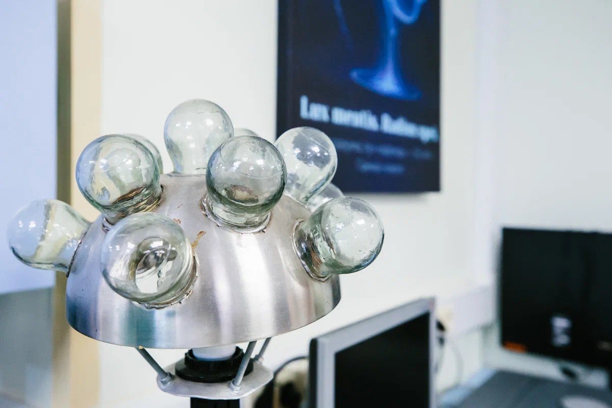 — Этот аппарат работает путем доставки высокой дозы ионизирующей энергии с высокой точностью к тем или иным участкам головного мозга. В основе его действия лежат источники радиоактивного кобальта (в современных аппаратах — 192), расположенные по периферии специального шлема. Используя сложные планирующие системы, коллиматоры различного диаметра, установленные между источником и пациентом, меняя время экспозиции и минимально корректируя положение пациента относительно недвижимого изоцентра самого аппарата, мы можем очень точно, прецизионно достигать высокой дозы ионизирующей энергии в мишени самой сложной формы в месте пересечения излучения этих источников. Это достигается точно и очень локально с высоким градиентом дозы ионизирующего излучения, которая быстро уменьшается за пределами новообразования. При этом нагрузка даже на соседние прилегающие нормальные структуры минимальна или ее вообще нет. А сама радиация в виде подводимых высоких разовых доз эффективно воздействует на делящиеся клетки, на клетки эндотелия сосудов и модулирует локальный иммунный ответ, запускает механизмы апоптоза (программируемой смерти клеток) именно в том месте, куда мы их направили с субмиллиметровой точностью.