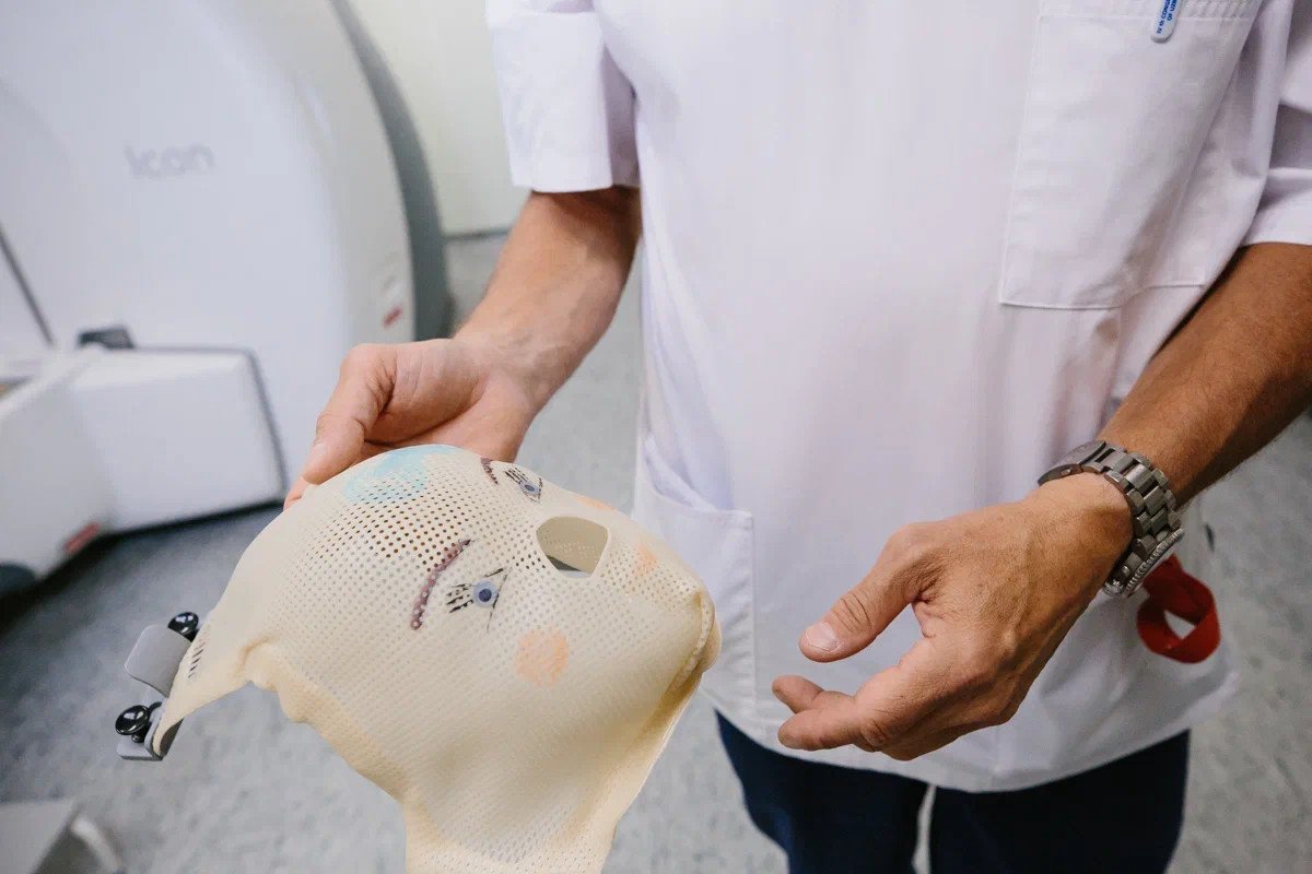— В аппарате «Гамма-нож» радиоактивные источники ионизирующего излучения фиксированы по периферии специального устройства — шлема, между которым и самим пациентом еще находятся коллиматоры. Система коллимации, уменьшение диаметра пучков приводит к тому, что именно в месте их пересечения в одной точке мы достигаем необходимого эффекта и подведения определенной дозы ионизирующего излучения. При этом пациент, как правило, фиксируется в стереотаксической раме. Когда мы говорим о линейном ускорителе, нужна маска. Впрочем, самые современные модели «Гамма-ножа», которые есть и у нас, позволяют лечить больного в жесткой, но не инвазивно фиксированной пластиковой маске, которая изготавливается индивидуально.