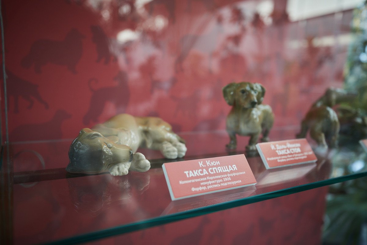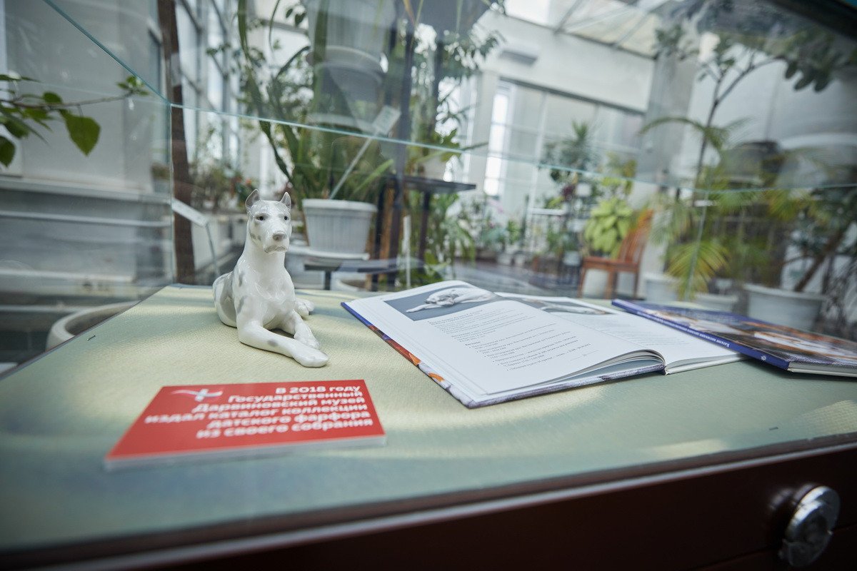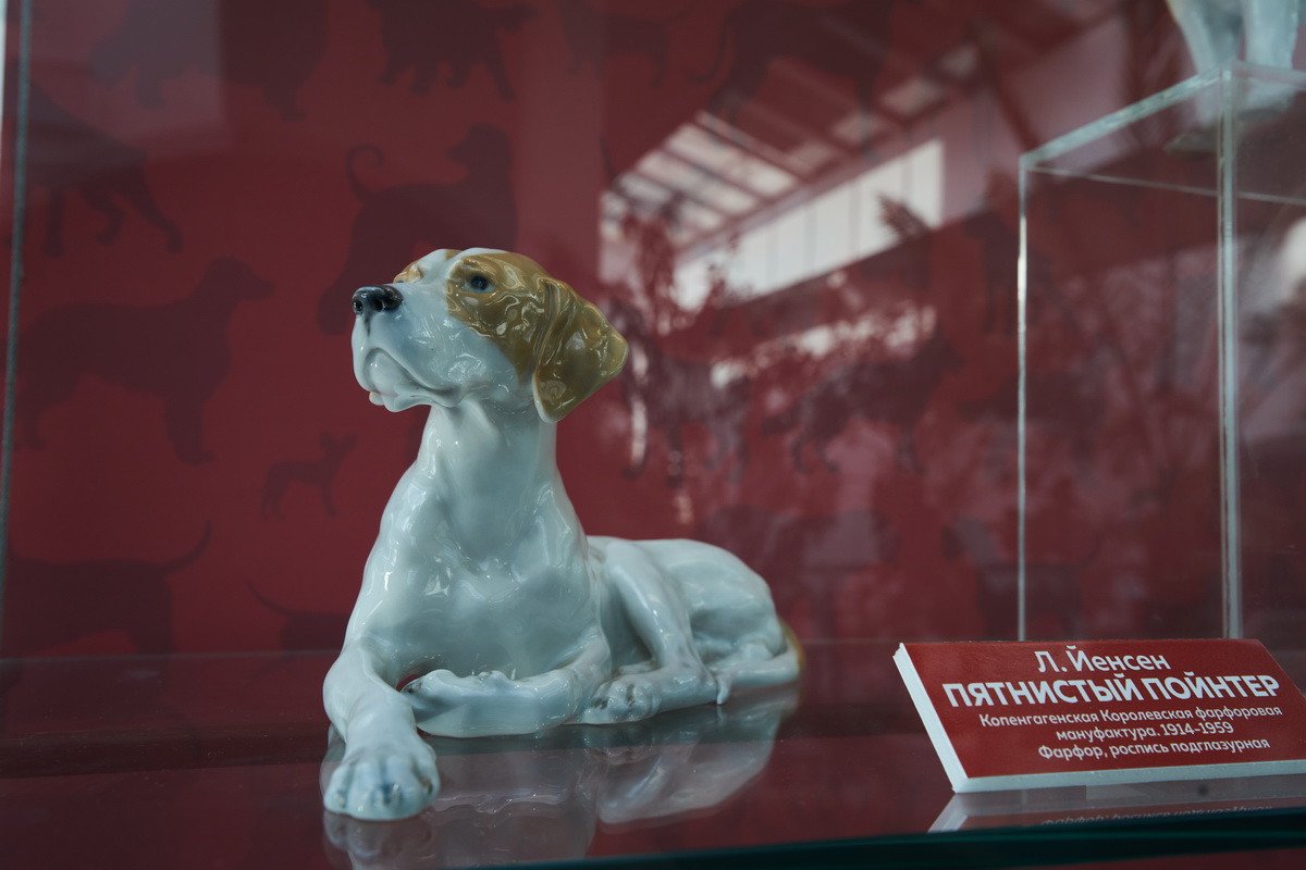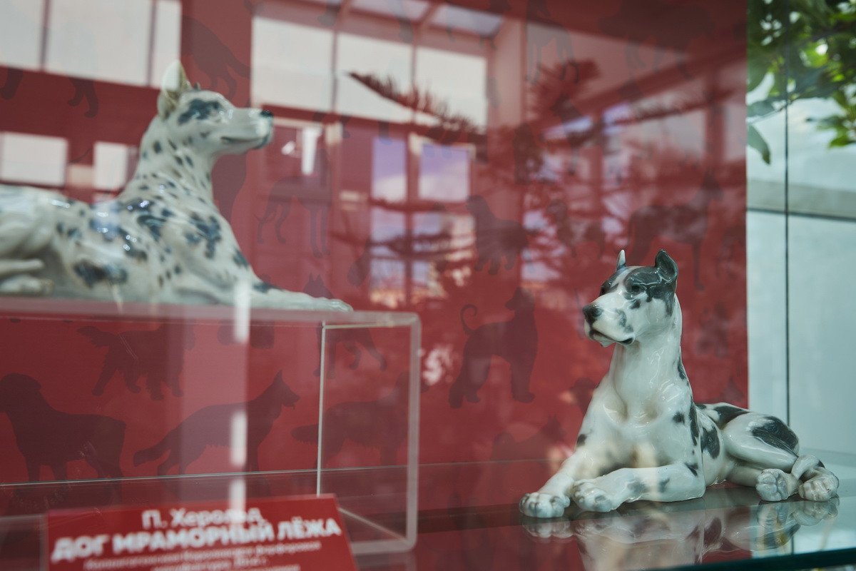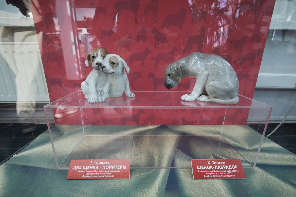 Пресс-показ начался с выставки датского анималистического фарфора эпохи модерн «Собаки Датского двора». Хранитель коллекции фарфора Антонина Борисовна Нефедова провела для гостей небольшую экскурсию, на которой подробно рассказала о почти полусотне скульптур собак производства «Королевской датской мануфактуры» и фабрики «Бинг и Грендаль», украшавшие дома европейской аристократии конца XIX — начала XX в. и членов семьи Романовых.