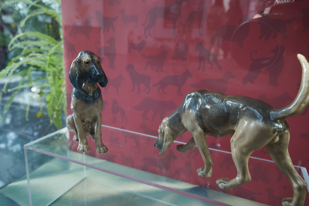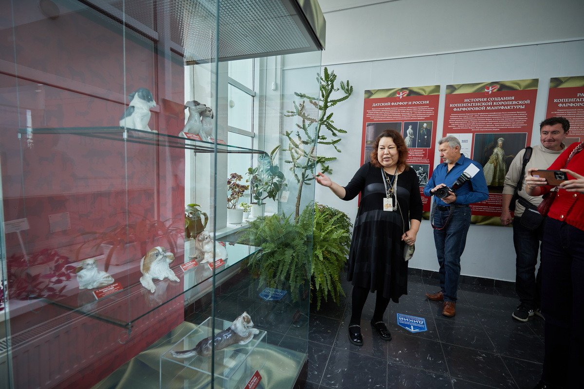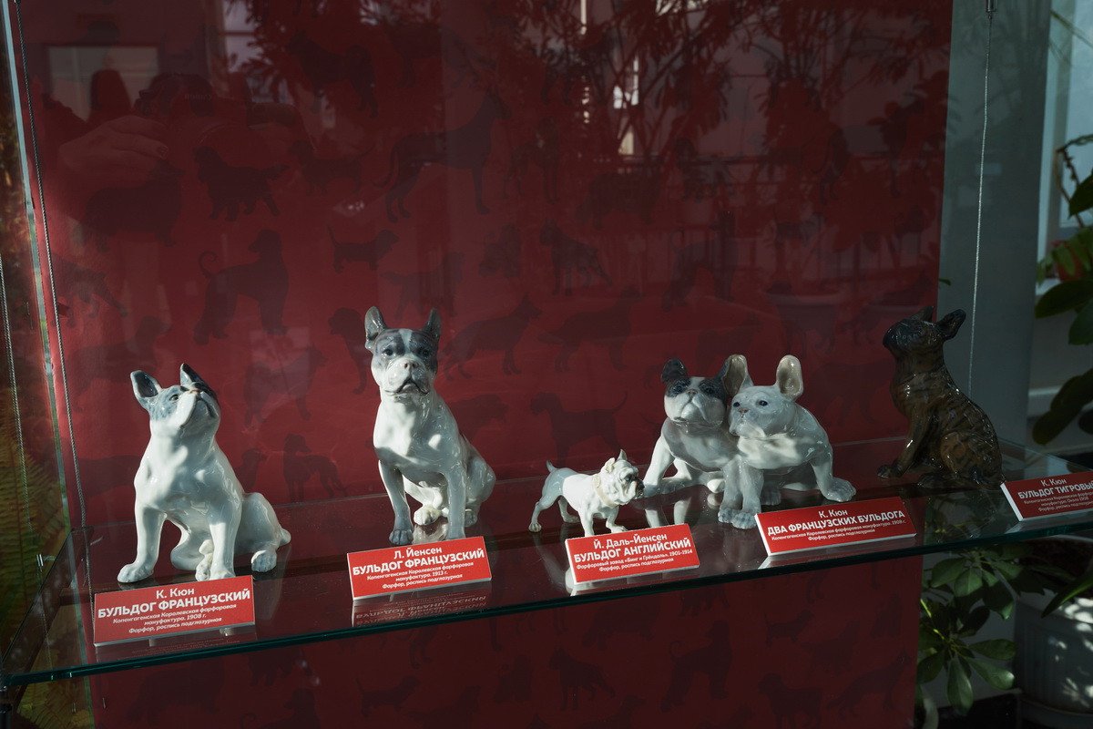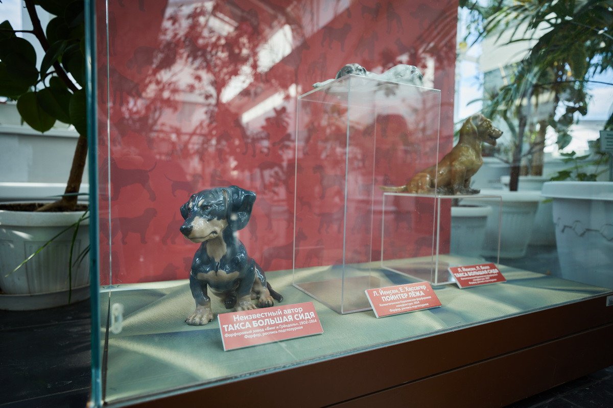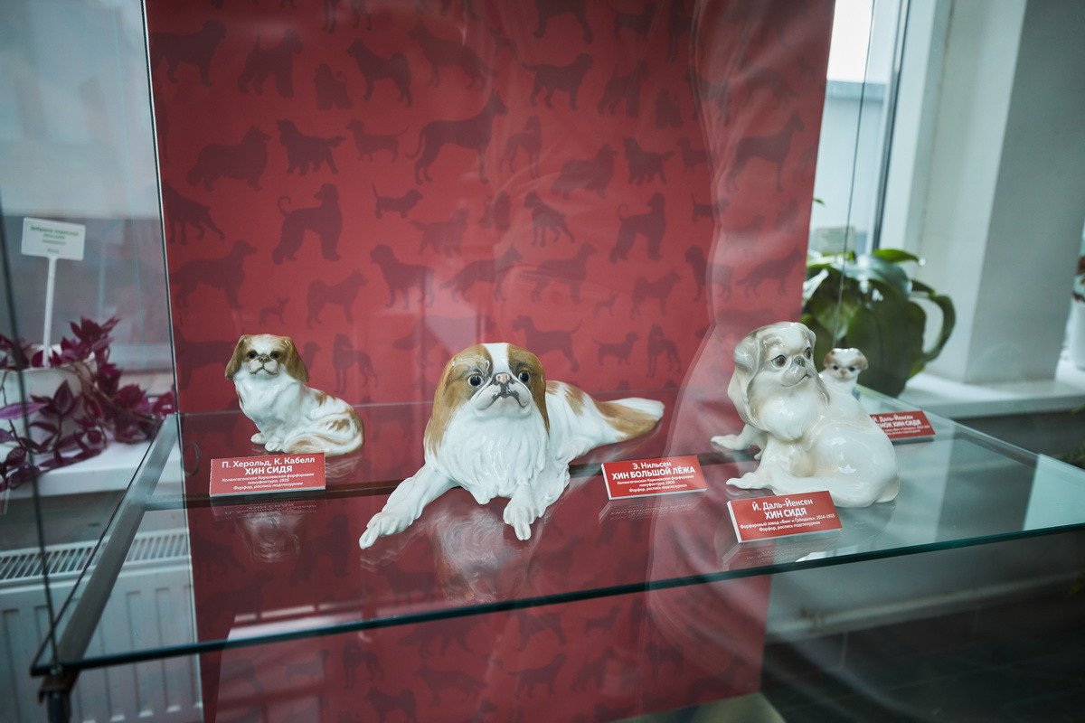 Пресс-показ начался с выставки датского анималистического фарфора эпохи модерн «Собаки Датского двора». Хранитель коллекции фарфора Антонина Борисовна Нефедова провела для гостей небольшую экскурсию, на которой подробно рассказала о почти полусотне скульптур собак производства «Королевской датской мануфактуры» и фабрики «Бинг и Грендаль», украшавшие дома европейской аристократии конца XIX — начала XX в. и членов семьи Романовых.