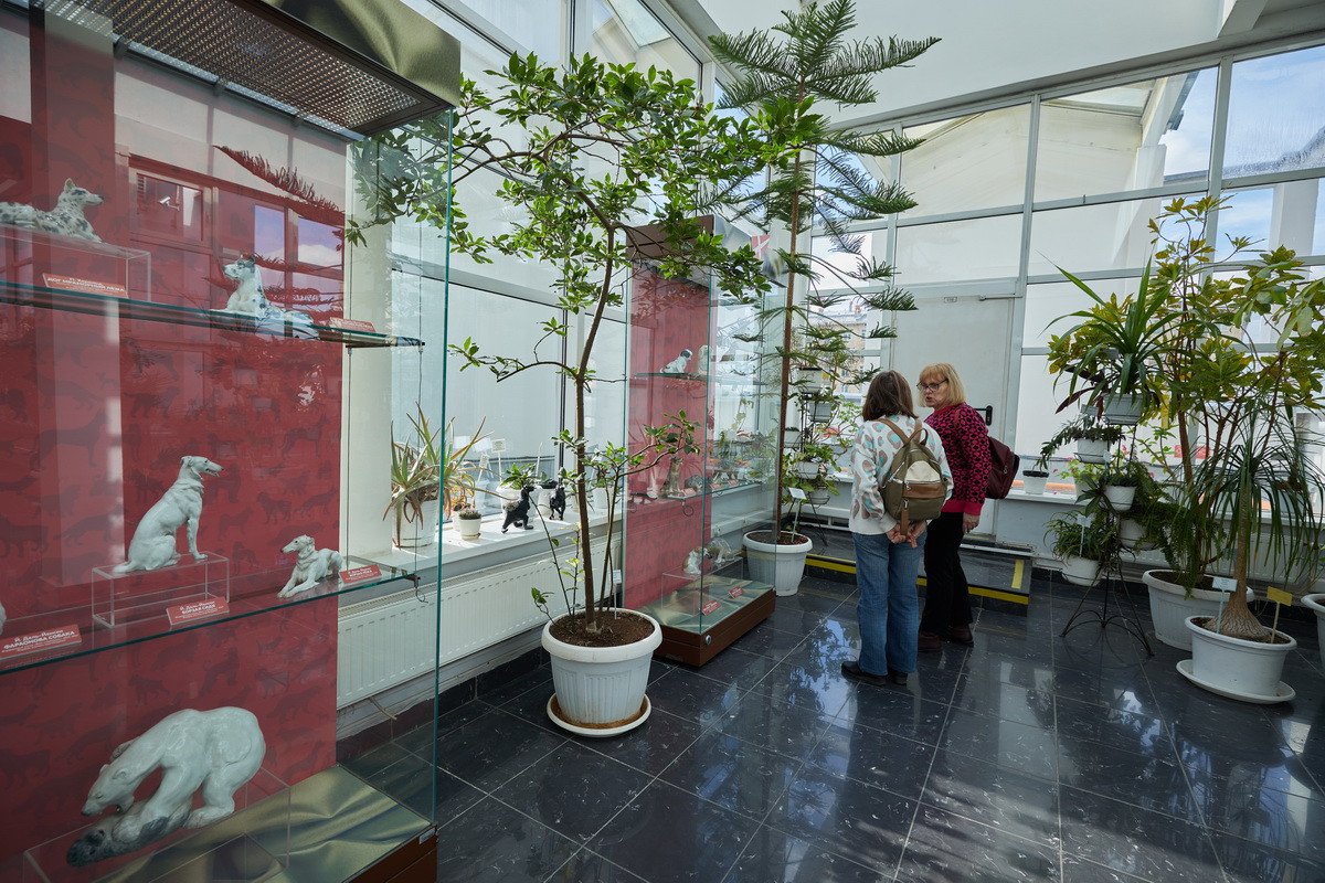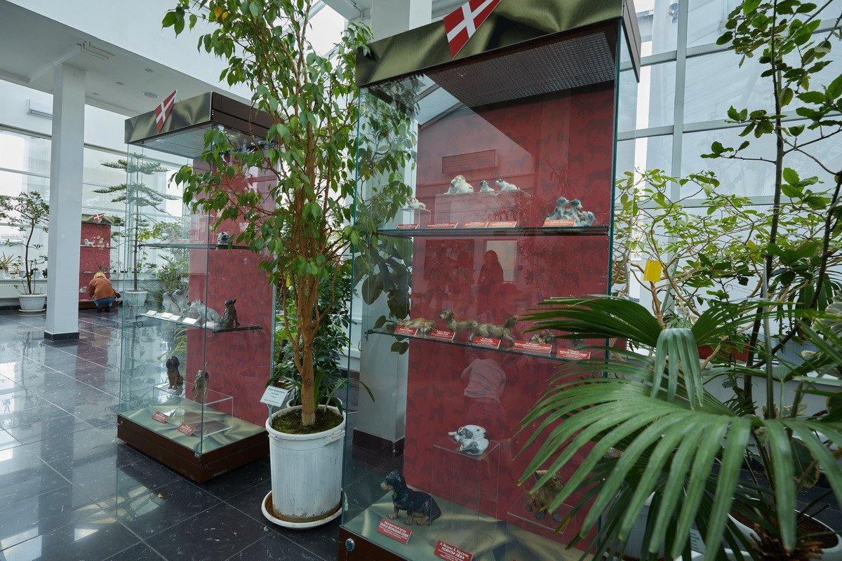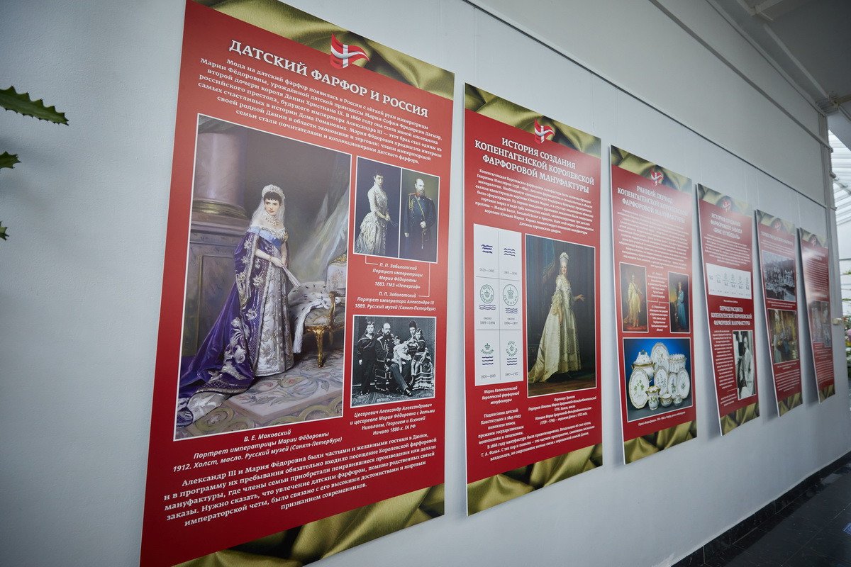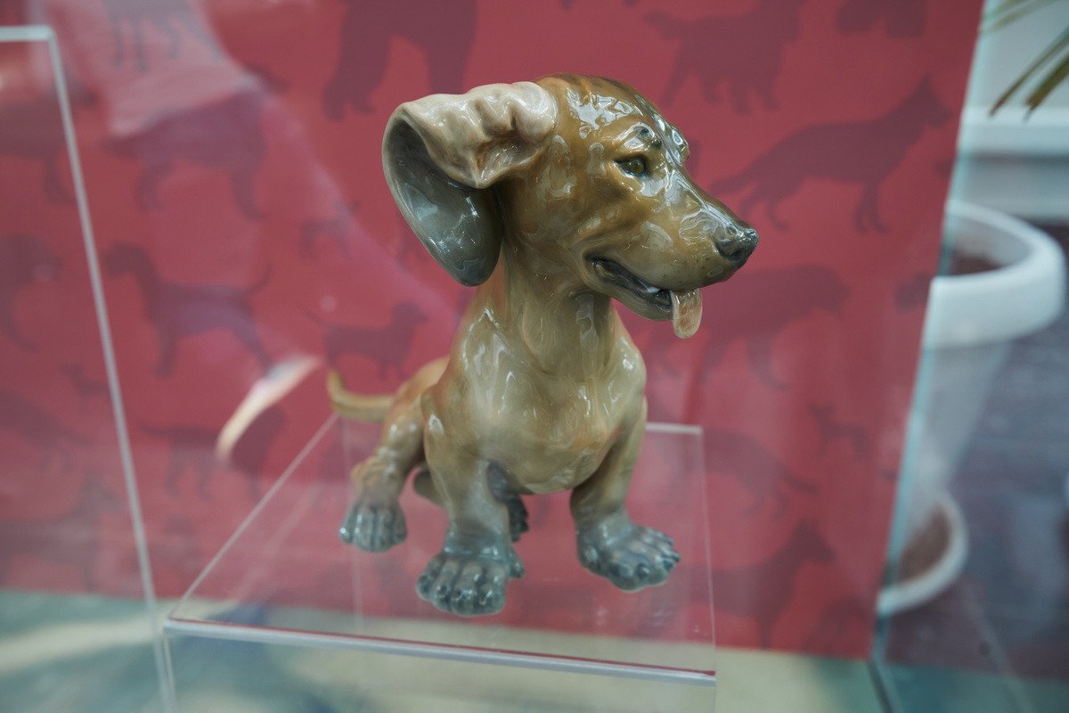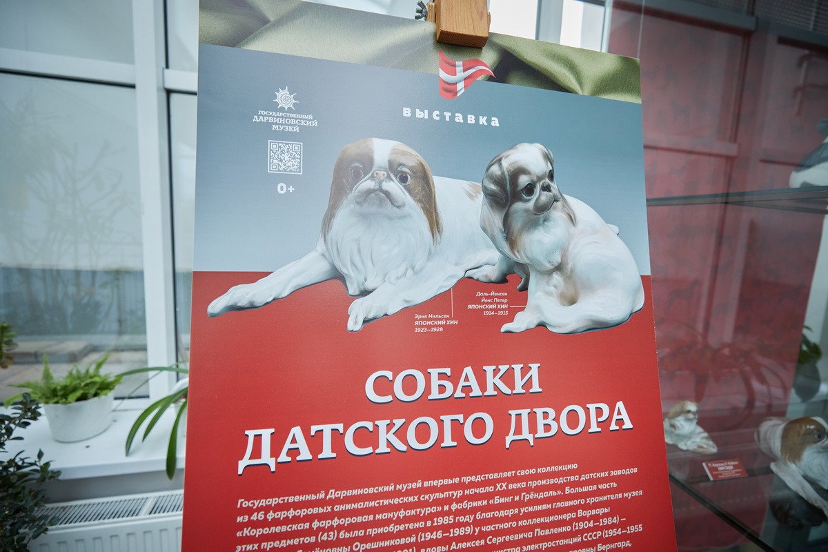 Пресс-показ начался с выставки датского анималистического фарфора эпохи модерн «Собаки Датского двора». Хранитель коллекции фарфора Антонина Борисовна Нефедова провела для гостей небольшую экскурсию, на которой подробно рассказала о почти полусотне скульптур собак производства «Королевской датской мануфактуры» и фабрики «Бинг и Грендаль», украшавшие дома европейской аристократии конца XIX — начала XX в. и членов семьи Романовых.