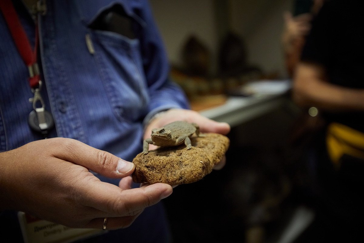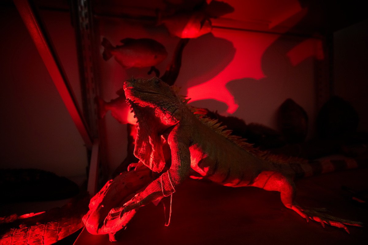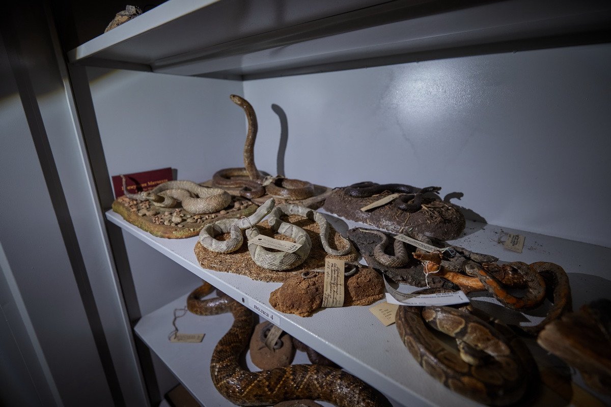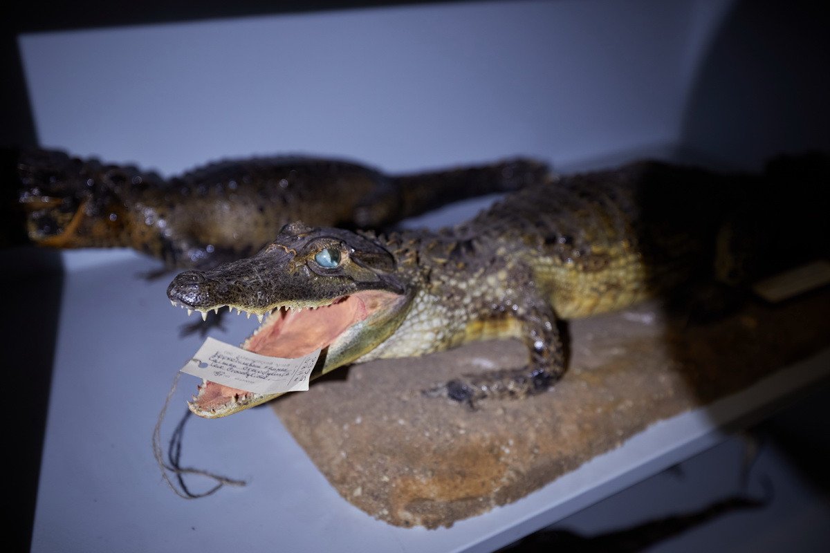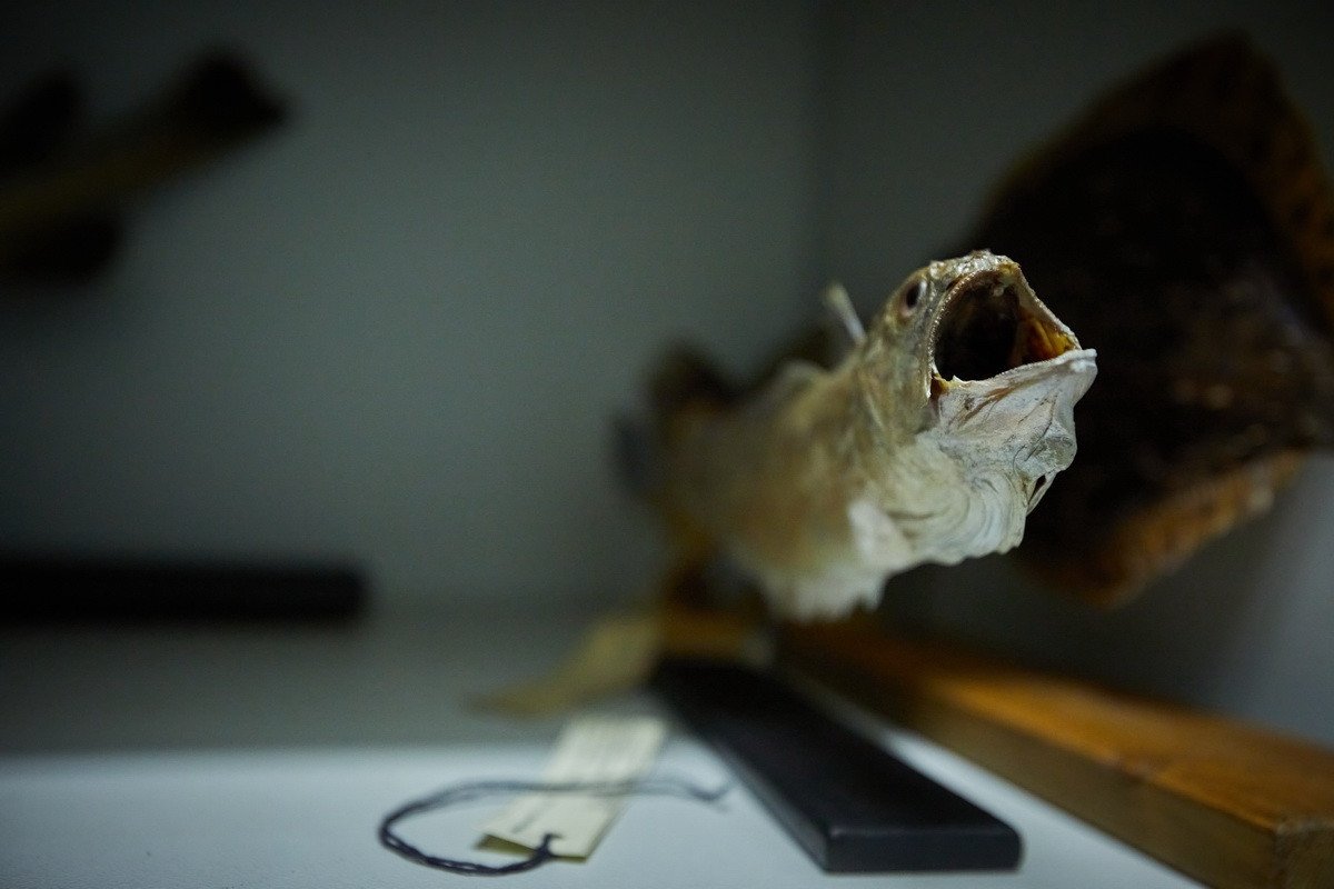 Наконец, самая длительная часть пресс-тура проходила в хранилище низших позвоночных — рыб, земноводных и рептилий. Хранитель Дмитрий Юрьевич Милосердов продемонстрировал гостям самых крупных в мире черепах, гигантскую игуану, акул, пираний, жабовидных ящериц, приобретенных еще в 1907 г. основателем музея. Он рассказал о том, как чучела попадают в музей, какую работу над ними проводят таксидермисты, как коллекция иногда пополняется за счет пойманной контрабанды, а также поделился несколькими историями: