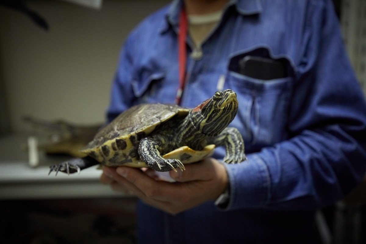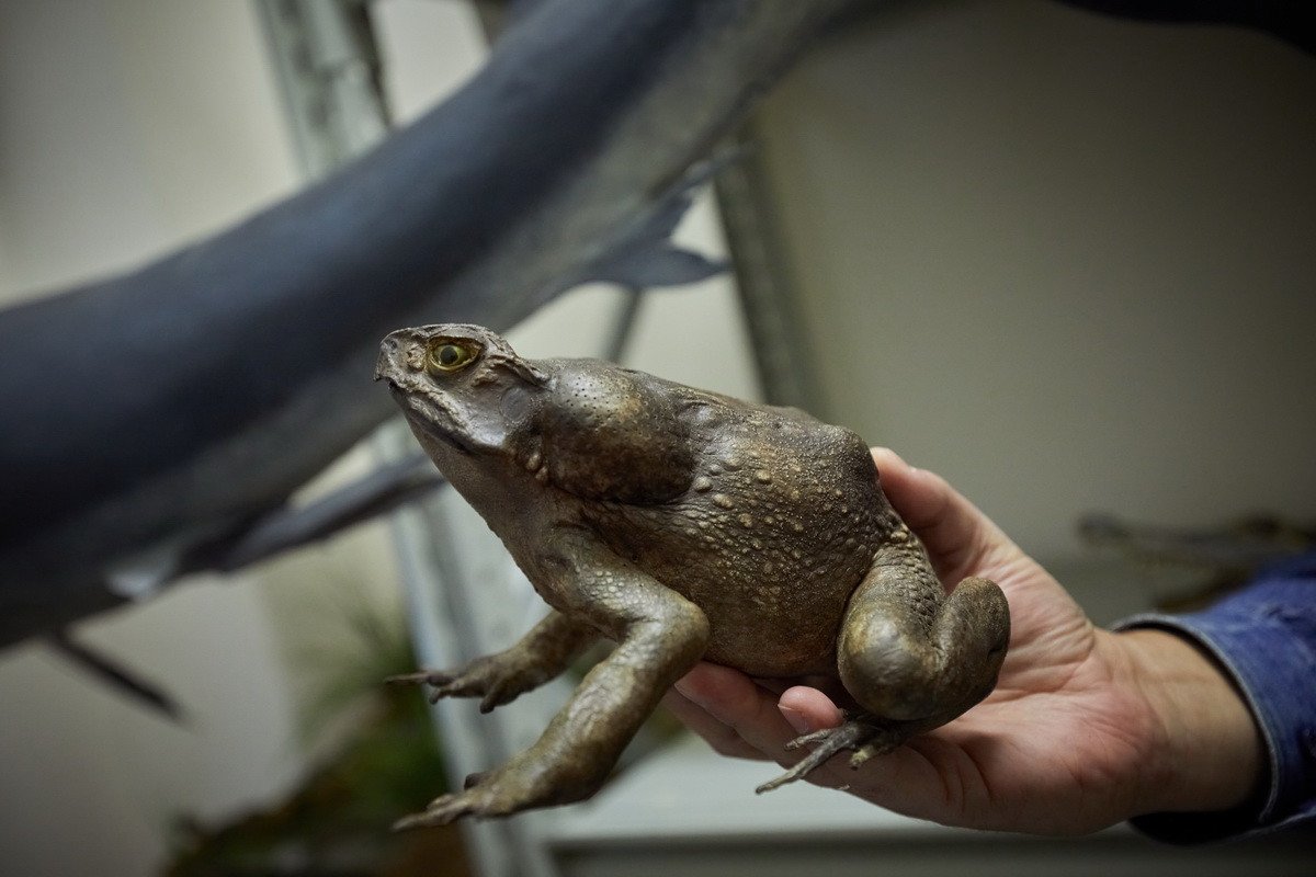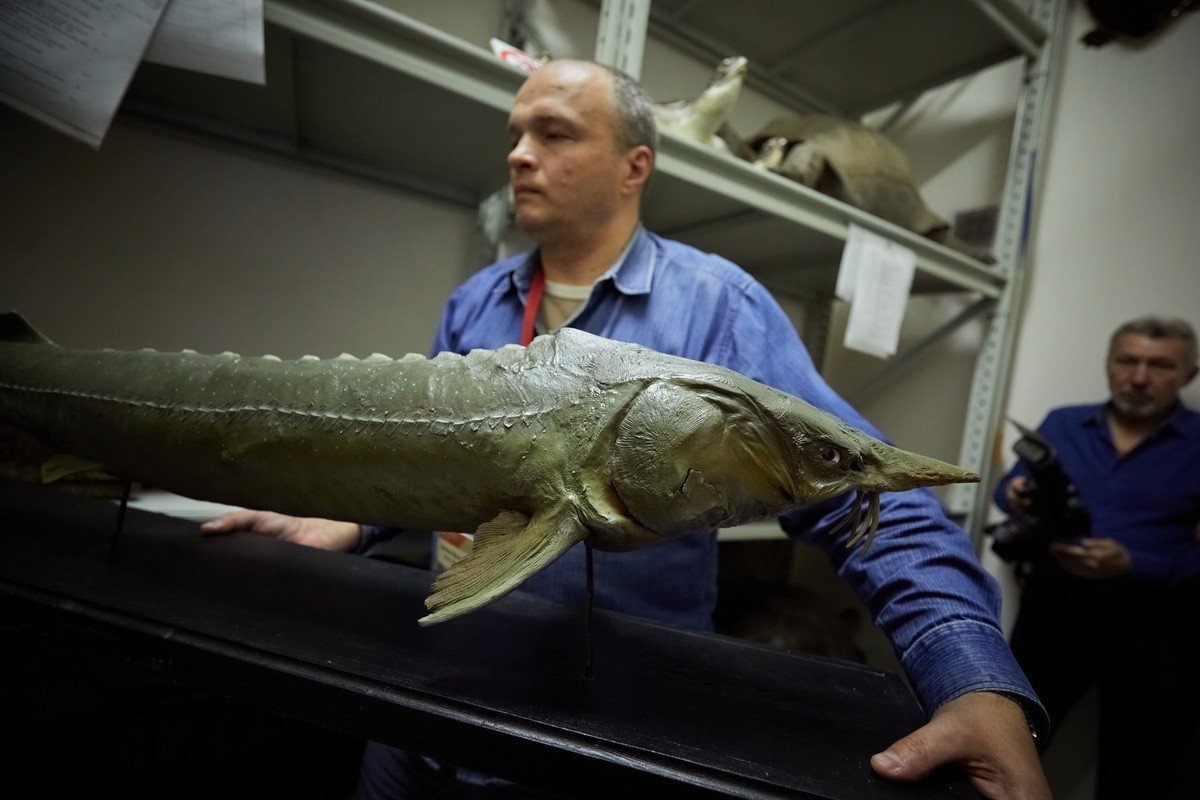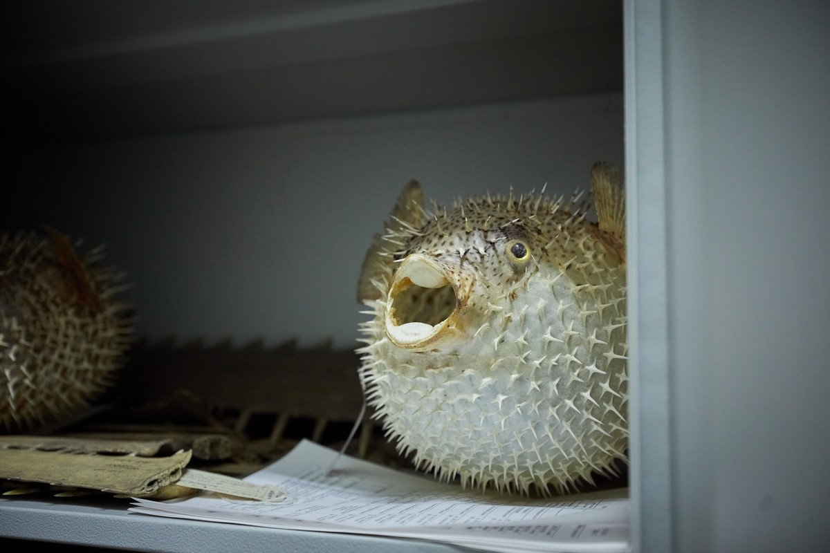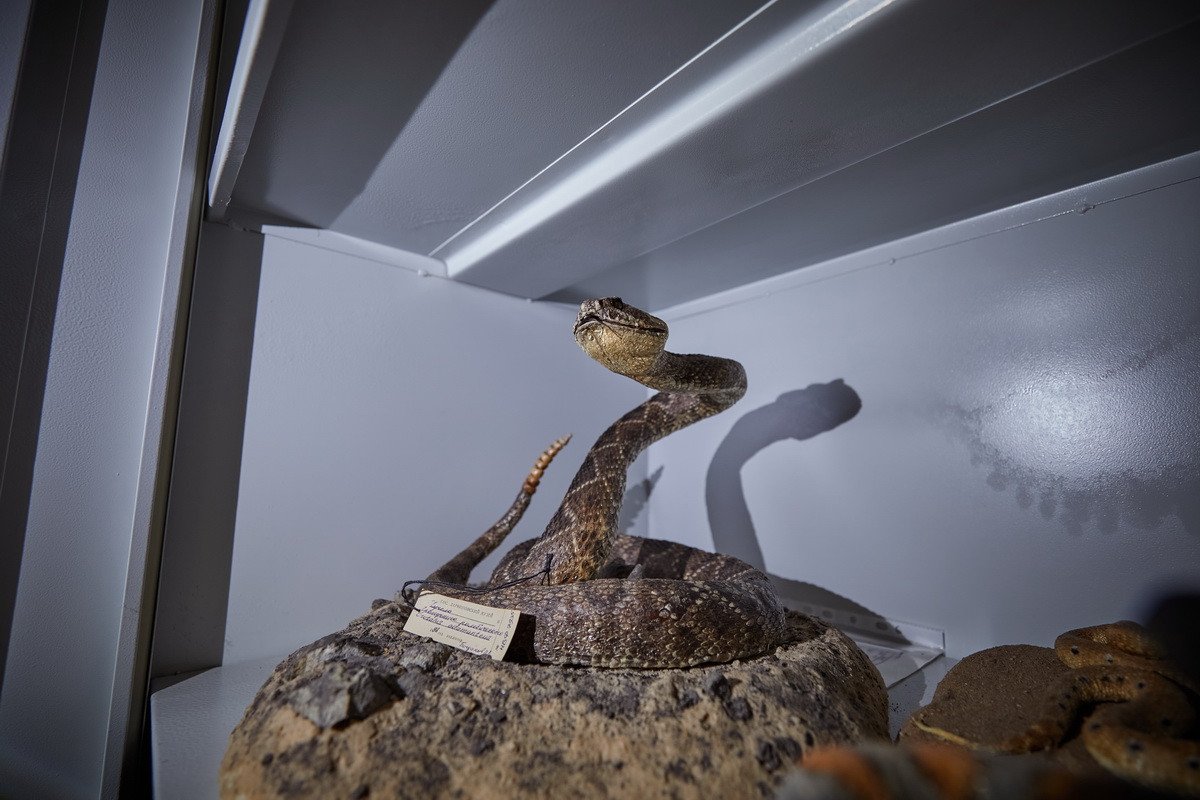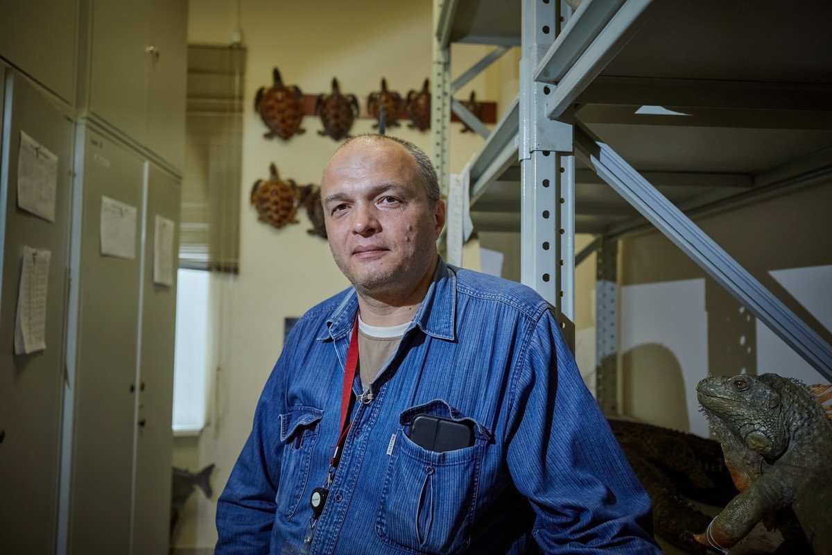 Наконец, самая длительная часть пресс-тура проходила в хранилище низших позвоночных — рыб, земноводных и рептилий. Хранитель Дмитрий Юрьевич Милосердов продемонстрировал гостям самых крупных в мире черепах, гигантскую игуану, акул, пираний, жабовидных ящериц, приобретенных еще в 1907 г. основателем музея. Он рассказал о том, как чучела попадают в музей, какую работу над ними проводят таксидермисты, как коллекция иногда пополняется за счет пойманной контрабанды, а также поделился несколькими историями: