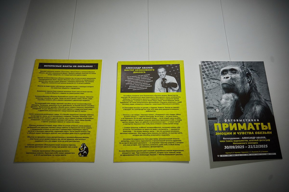Завершился день вернисажной выставкой мастера анималистической фотографии Александра Владимировича Авалова «Приматы», во время которой он поделится историями снимков и их героев. Увидеть эти выставки, как и постоянную всю экспозицию, может любой посетитель Дарвиновского музея.