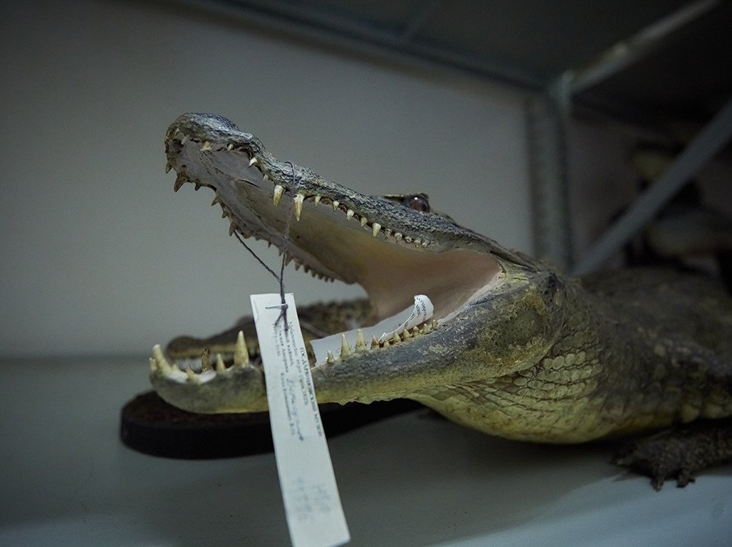 Кстати, забавный случай. Вы наверняка все были в нашей экспозиции, где лежит огромный нильский крокодил. Нам звонят с таможни и говорят: “Вы помните, мы в Шереметьевской таможне в 1996 г. дарили вам сумки”. Мы говорим: “Да, помним, очень благодарны, что-то экспонируем, что-то в хранилище, спасибо большое”. Они говорят: “Мы тут случайно на складе временного хранения нашли еще одного крокодила, хотели бы вам передать”. Я по работе периодически езжу как эксперт по этим складам временного хранения — это огромное помещение, стоят огромные металлические стеллажи, заполненные всякой контрабандой. Потерять там что-то проще простого. Я ожидал, что, как обычно, приедет хрупкая девушка-таможенница с маленьким крокодильчиком. И вдруг звонок: “Откройте ворота, пожалуйста”. И во внутренний двор заезжает машина, у которой задние двери распахнуты и оттуда выглядывает хвост крокодила, к которому сзади привязан красный флажок. Соответственно, это тот крокодил, который сейчас стоит в экспозиции. Как его можно было потерять на складе временного хранения, для меня загадка».