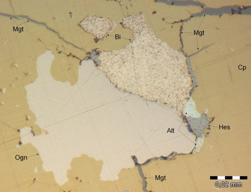Иллюстрация: Огнитит (Ogn) в срастании с самородным висмутом (Bi), алтаитом (Alt) и гесситом (Hes). Основная матрица — халькопирит (Cp)/Пресс-служба СФУ