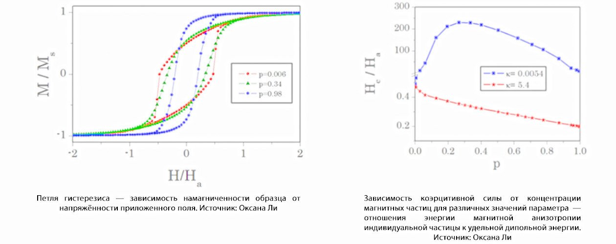 Детальный микромагнитный расчёт этой зависимости выполнили для наночастиц, хаотически распределённых на плоскости, при этом средняя плотность частиц различалась. Также была учтена случайная ориентация осей лёгкого намагничивания частиц (это направление в ферро- или ферримагнетике, вдоль которого намагничивание образца до предельных значений происходит легче всего). Это соответствует условиям стандартных магнитометрических исследований порошков и некоторых приложений (частицы, распределённые в немагнитных матрицах). Оказалось, что диполь-дипольное взаимодействие изменяет зависимость коэрцитивной силы (напряжённость магнитного поля, необходимая для полного размагничивания образца) от объёмной концентрации частиц — от нелинейной монотонной до зависимости с максимумом. Это изменение определяется соотношением энергии магнитной анизотропии индивидуальной частицы (зависимости её магнитных свойств от выбранного направления в образце) и удельной дипольной энергии.