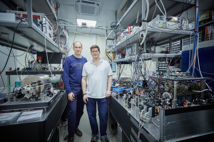 С квантовым компьютером на атомной платформе журналистов познакомили научные сотрудники Центра квантовых технологий МГУ Глеб Игоревич Стручалин и Иван Борисович Бобров (слева направо).