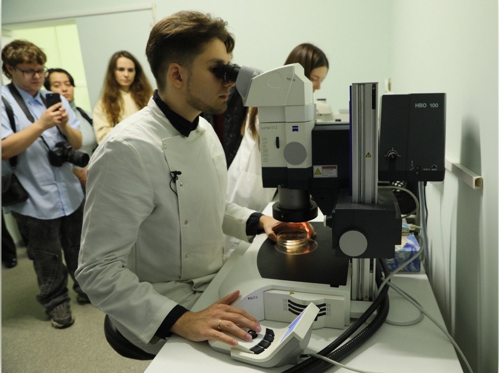 Участники студенческого тура побывали в лаборатории, где находится институтская культура трихоплаксов, на сегодняшний день включающая около 1,4 тыс. особей. Кроме того, ученые рассказали молодым людям о биохимических основах и эволюции нервной системы.