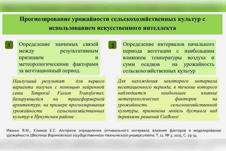 «Мы рассматривали две нейросети — Temporal Fusion Transformer и DeepArt. Во время испытаний на примере прогнозирования урожайности в сельскохозяйственных районах Иркутской области лучший результат показала первая из них, — пояснил Я.М. Иваньо. — Помимо этого, мы использовали алгоритмы машинного обучения CatBoost (Categorical Boosting), RandomForest и LightGBM. Они широко используются для прогнозирования табличных данных и коротких временных рядов (перечней значений одного и того же показателя — например, урожайности или температуры воздуха — зафиксированных в разные моменты времени. — Примеч. корр.).