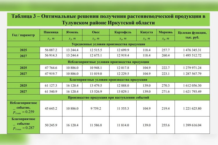 Новый подход позволяет моделировать урожайность разных культур — пшеницы, ячменя, овса, картофеля, капусты, моркови — и планировать выручку, которую может получить хозяйство, реализовав продукцию в разных условиях деятельности.
