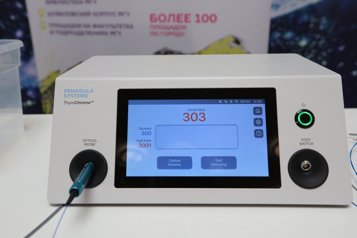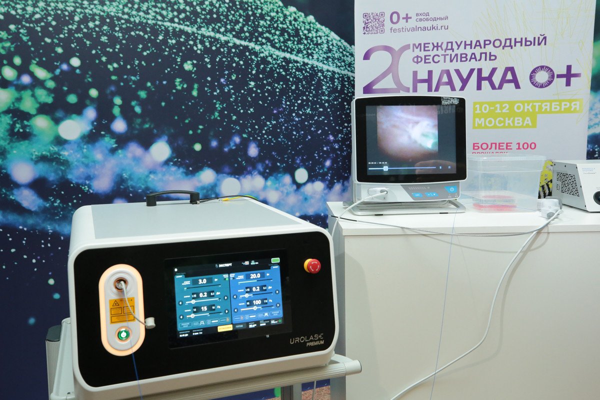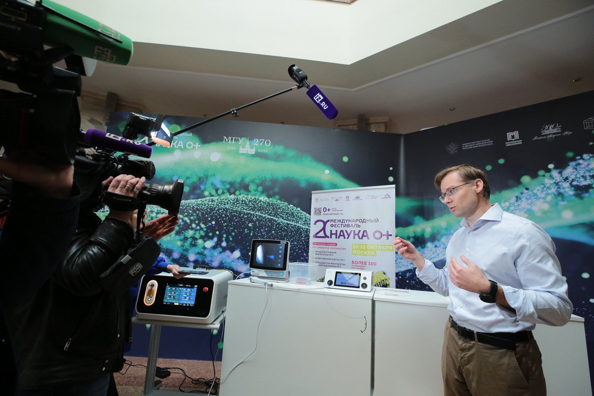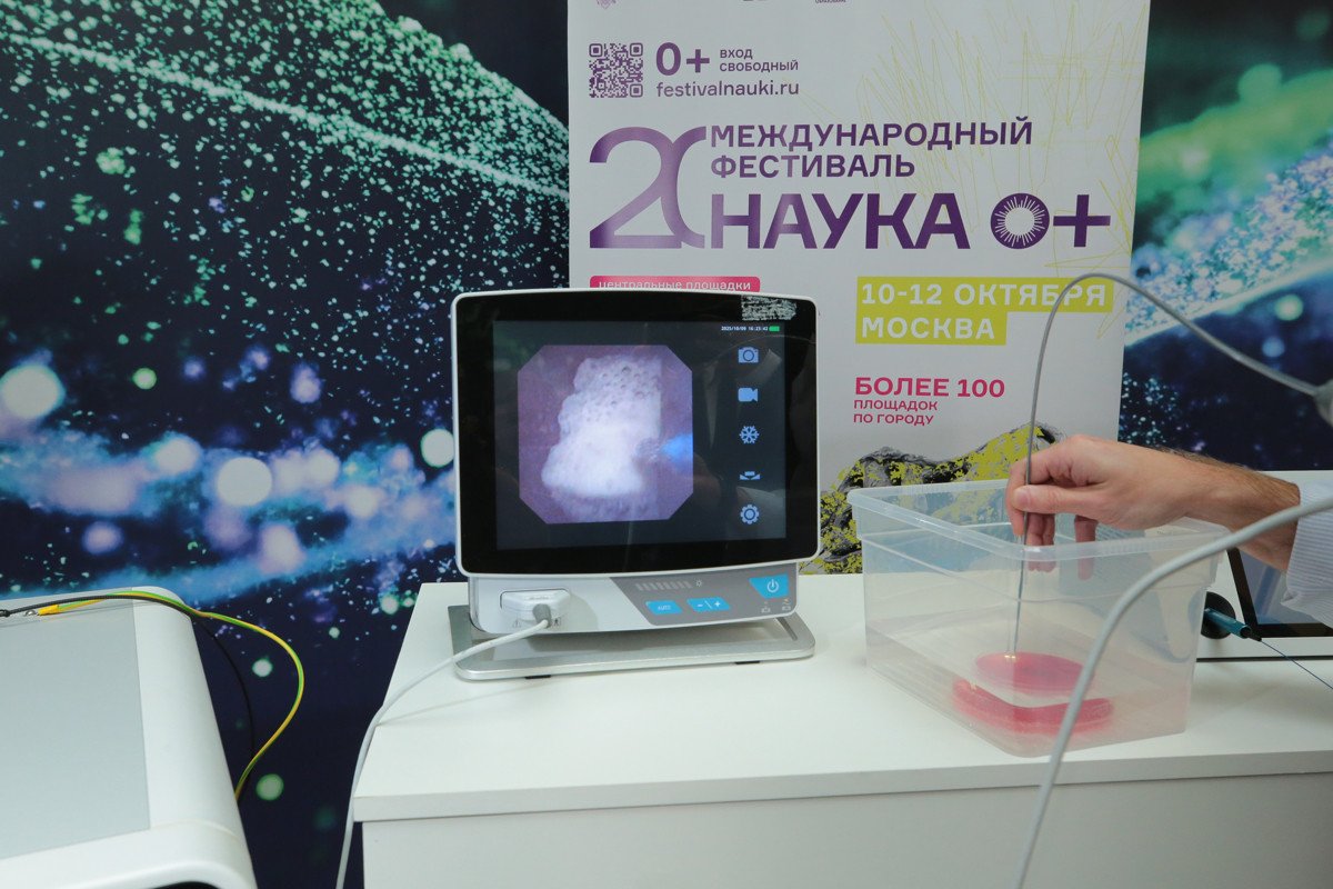 На одной из площадок фестиваля NAUKA 0+, в Фундаментальной библиотеке МГУ им. М.В. Ломоносова журналистам продемонстрировали новейшие разработки, которые уже применяются в медицине: систему интраоперационной диагностики в эндокринной хирургии на основе фотоники и фотонные технологии для повышения эффективности и безопасности лазерной хирургии. В МГУ под руководством доктора физико-математических наук Евгения Александровича Ширшина и директора Университетской клиники МНОИ Армаиса Альбертовича Камалова совместно с индустриальным партнером ООО «ВПГ Лазеруан» был создан умный лазер, позволяющий врачу при малоинвазивных операциях прицельно облучать камни в почках, превращая их в пыль и предотвращая воздействие лазера на ткань почки. Примечательно, что от рождения идеи до ее воплощения (получения медицинской регистрации на прибор) прошло всего около двух лет. Эту уникальную разработку представителям СМИ показали в действии сегодня, а в ближайшие дни увидеть ее смогут и все гости фестиваля NAUKA 0+.