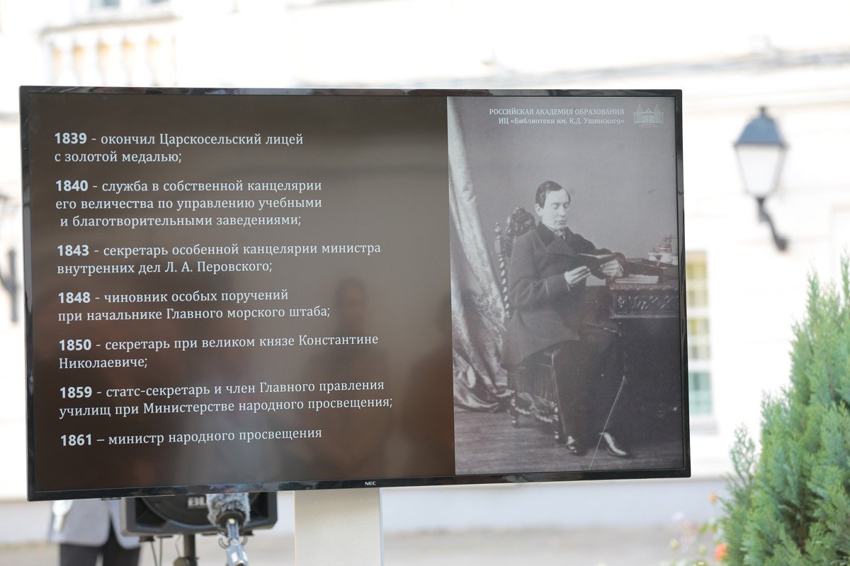 Научная педагогическая библиотека им. К.Д. Ушинского давно входит в структуру Российской академии образования (РАО) и представляет собой главный центр знаний по образованию и педагогике. И сегодня внутренний двор библиотеки в Большом Толмачевском переулке напротив Третьяковской галереи украсили два новых памятника — А.В. Головнину, министру народного просвещения Российской империи в 1961–1966 гг. и наркому просвещения РСФСР в 1940–1946 гг. В.П. Потемкину.