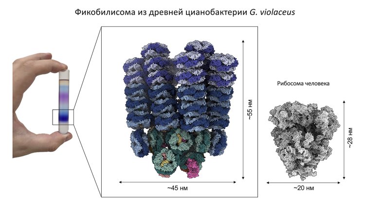 Фикобилисома из древней цианобактерии, показанная в масштабе с человеческой рибосомой. Источник: ФИЦ Биотехнологии РАН