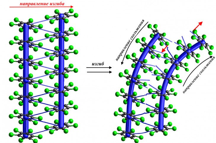 В работе рассмотрены два органических кристалла: гексахлорбензол и гексабромбензол. Они оба гибкие, но в разной степени: последний более жесткий и гнется хуже. С помощью расчетных методов исследователи проанализировали внутреннее взаимодействие между атомами, молекулами и слоями и рассчитали энергию связей для всех этих уровней. Одна из общепринятых гипотез говорит о том, что гибкие кристаллы имеют слоистую структуру и при сгибании эти слои смещаются друг относительно друга. «Это похоже на сгибание стопки бумажных листов, — объясняет научный сотрудник ИХТТМ СО РАН кандидат химических наук Ирина Сергеевна Третьякова. — Когда мы берем стопку и прикладываем усилие, листы сдвигаются друг относительно друга, вы можете это очень просто проверить».