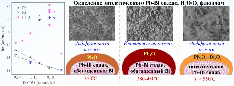 Сотрудники лаборатории термодинамики веществ и материалов Института теплофизики им. С.С. Кутателадзе СО РАН при исследовании поведения расплава свинцово-висмутовой эвтектики в среде водяного пара, кислорода и водокислородного флюида впервые выявили синергетический эффект воды и кислорода на окисление, а также немонотонную зависимость скорости окисления от температуры и состава флюида. Полученные результаты важны для обеспечения безопасной работы реакторов на быстрых нейтронах.