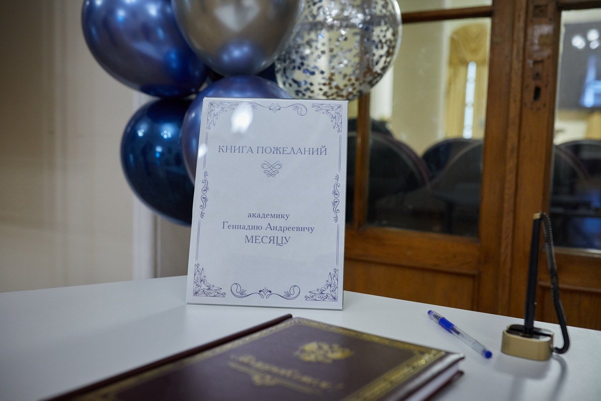«Выдающийся ученый, организатор и наставник, основатель всемирно известной научной школы, вы вписали яркую, значимую страницу в историю приоритетных направлений физики. Воспитали несколько поколений талантливых исследователей. Ваш насыщенный, профессиональный жизненный путь, беззаветное служение избранному делу, Отечеству достойны искреннего признания», ― передал Г.А. Месяцу слова поздравления президент РФ В.В. Путин.