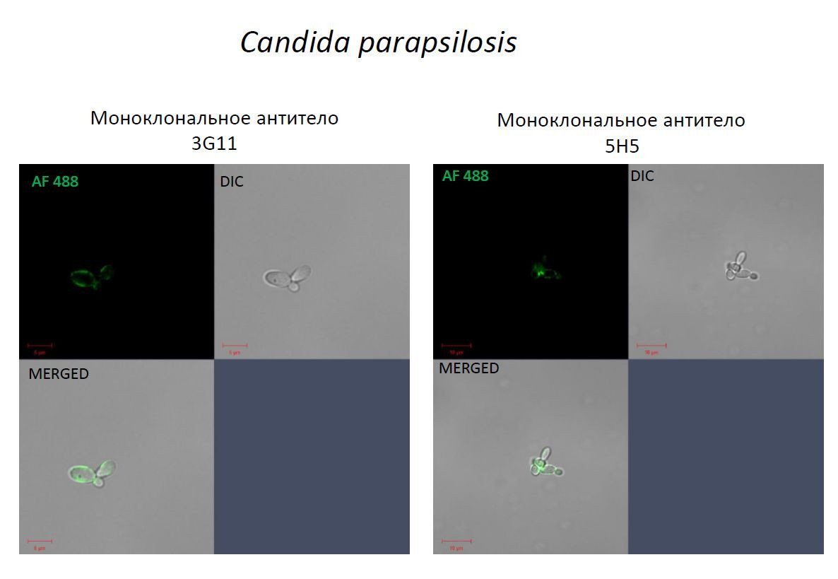 Иллюстрация: Иммунофлюоресцентная микроскопия дрожжевых грибов вида Candida Papapsilosis, выявленных моноклональными антителами 3G11 и 5H5, обладающими способностью защитить мышей, зараженных смертельной дозой грибка Candida/Фото предоставлено Андреем Матвеевым