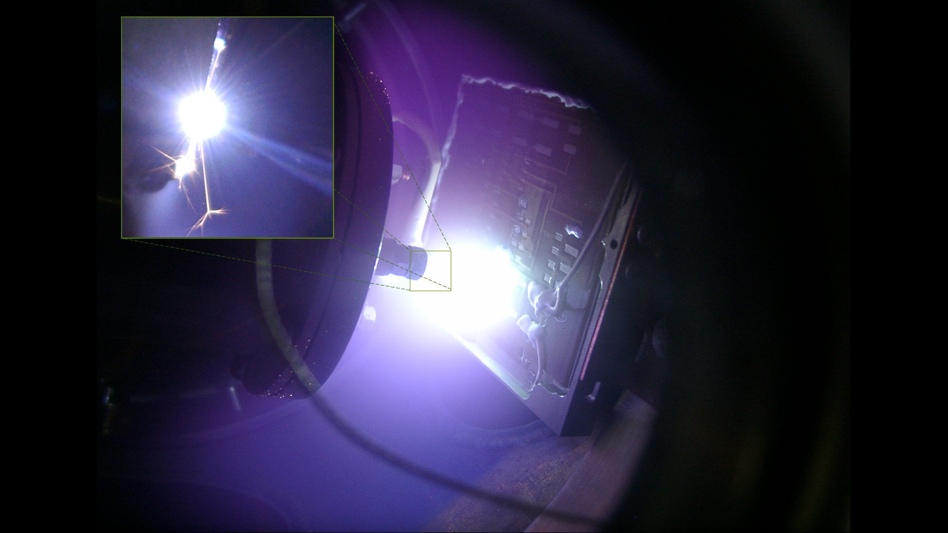 Иллюстрация: Вакуумная дуга в экспериментах на макете узла радиоэлектронной аппаратуры космического аппарата. Изображение исследователей/Пресс-служба ТНЦ СО РАН