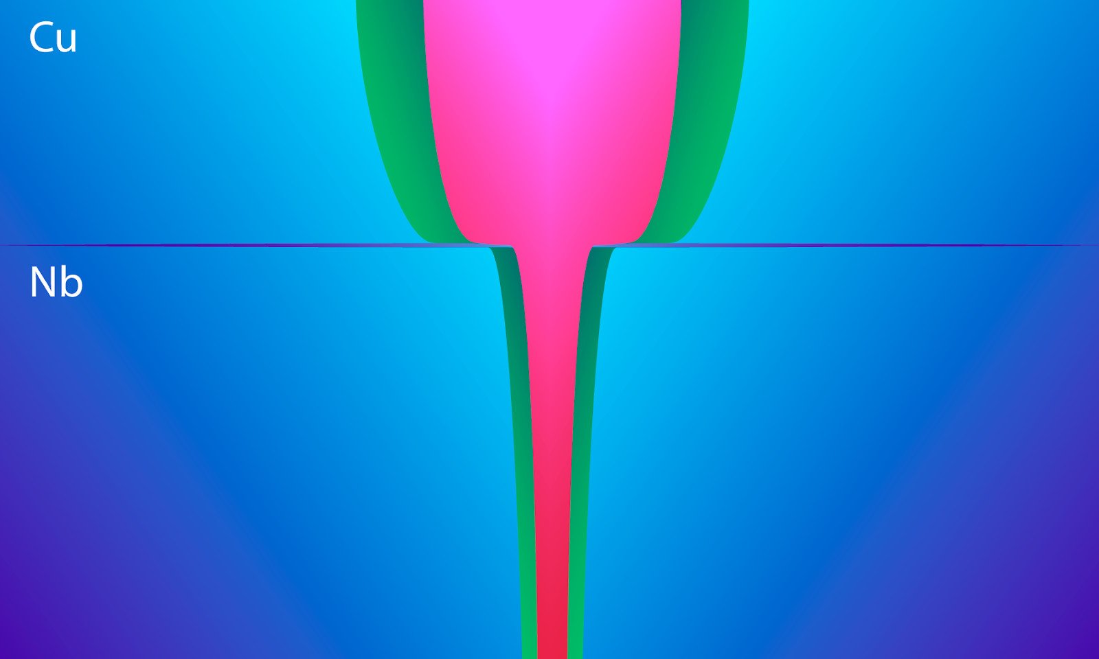 Изображение: Квантовый вихрь на границе сверхпроводник (Nb) — нормальный металл (Cu). Автор изображения: Елена Хавина (пресс-служба МФТИ)