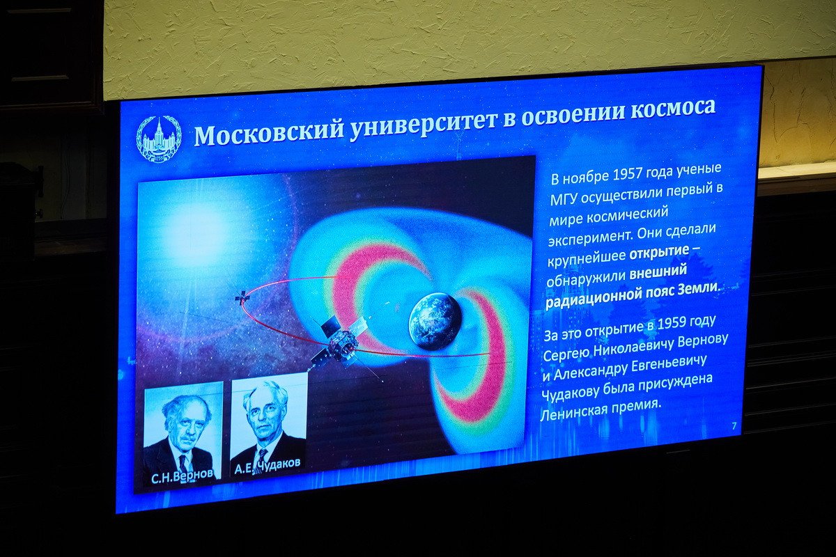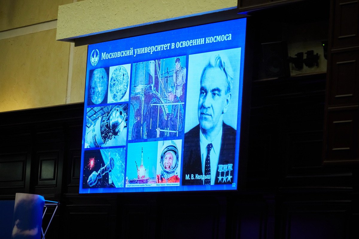 В своем докладе ректор напомнил о решающем вкладе ученых МГУ в создание карт обратной стороны Луны, в обеспечение мягкой посадки станции «Луна-9», в изучение радиационной обстановки на всех пилотируемых кораблях и орбитальных станциях. Отдельно он остановился на роли математиков и механиков Московского университета, работавших в тесном контакте с конструкторским бюро С.П. Королева. Садовничий также рассказал о собственных работах по созданию тренажера-центрифуги для имитации невесомости и о решении проблемы запаздывания взора у космонавтов, удостоенных Государственных премий СССР и РФ.