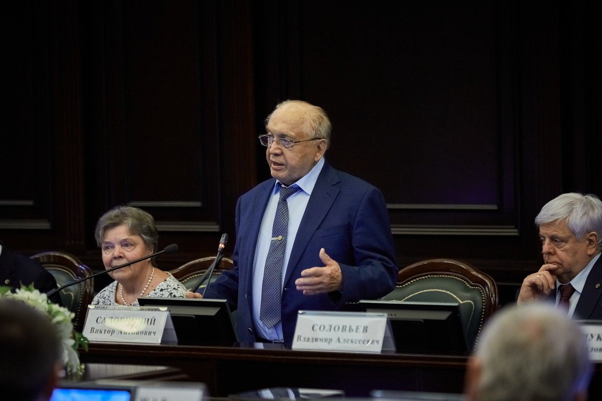 Выступление научного руководителя факультета космических исследований МГУ, дважды Героя Советского Союза академика В.А. Соловьева было посвящено современному состоянию и перспективам пилотируемой космонавтики. Он подробно остановился на научной программе российского сегмента МКС и планах создания Российской орбитальной станции, подчеркнув необходимость подготовки нового поколения специалистов.