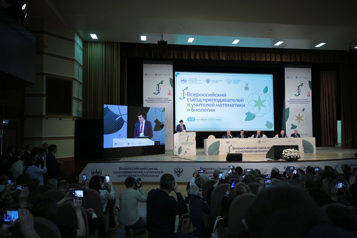 Всероссийский съезд преподавателей и учителей математики и биологии стартовал 1 декабря 2025 г. в Московском государственном университете им. М.В. Ломоносова. Пленарное заседание открыли министр просвещения Сергей Сергеевич Кравцов, министр науки и высшего образования Валерий Николаевич Фальков и ректор МГУ Виктор Антонович Садовничий.