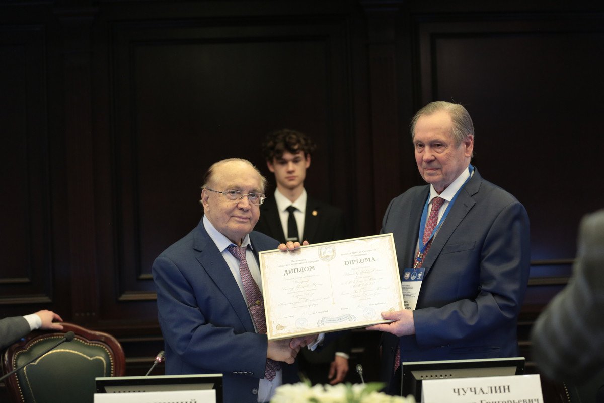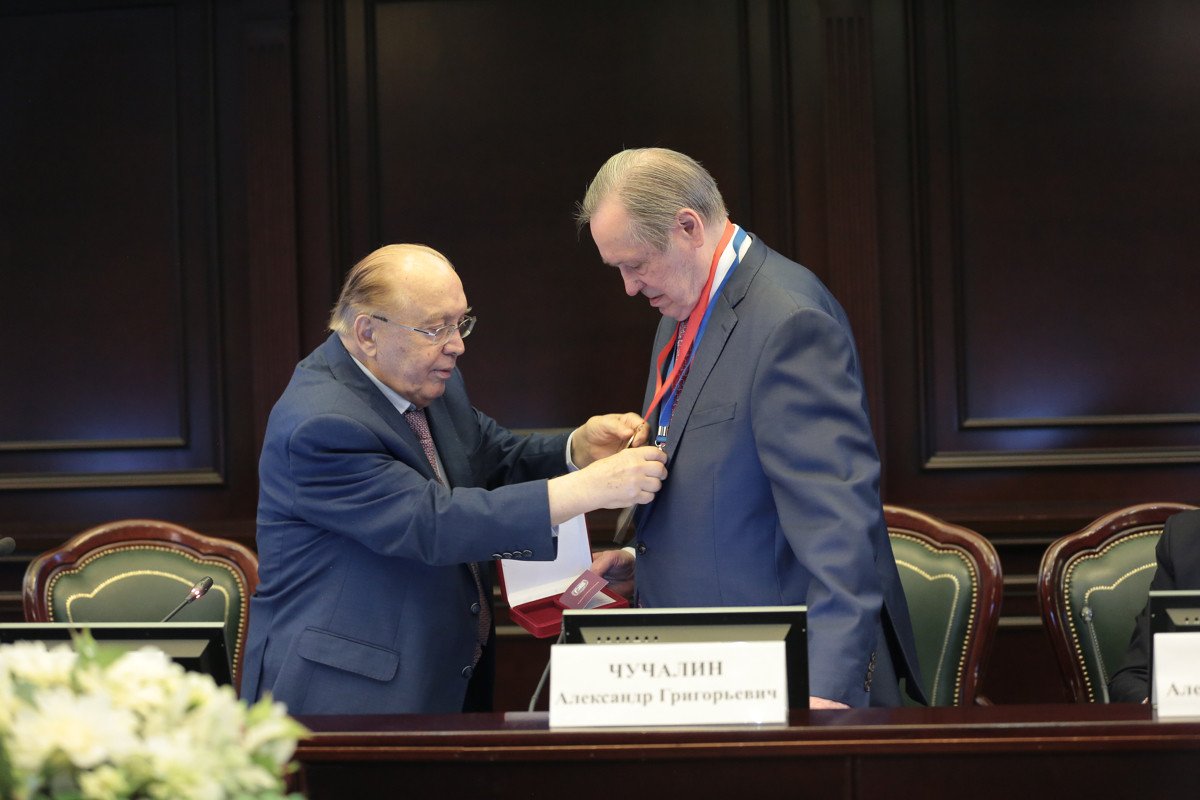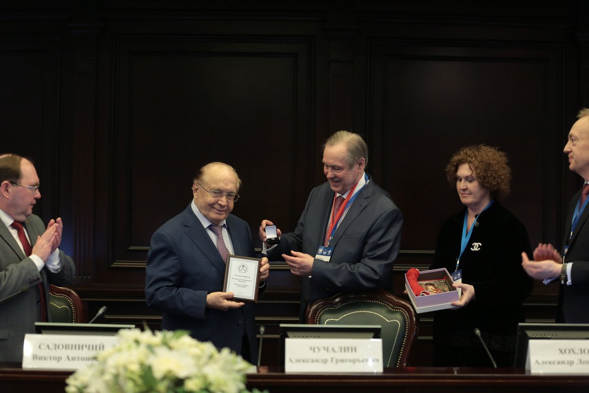 Виктор Антонович вручил академику Александру Григорьевичу Чучалину диплом Почетного члена МОИП и памятную медаль. Ректор МГУ сердечно поблагодарил А.Г. Чучалина за его многолетний труд на страже здоровья людей.