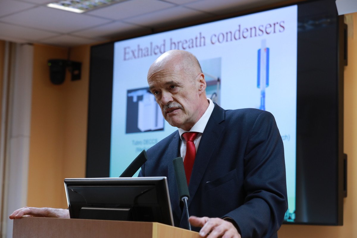 16:29 Аркадий Карякин рассказывает об исследованиях на основе выдыхаемых аэрозолей с участием больных муковисцидозом и курильщиков.