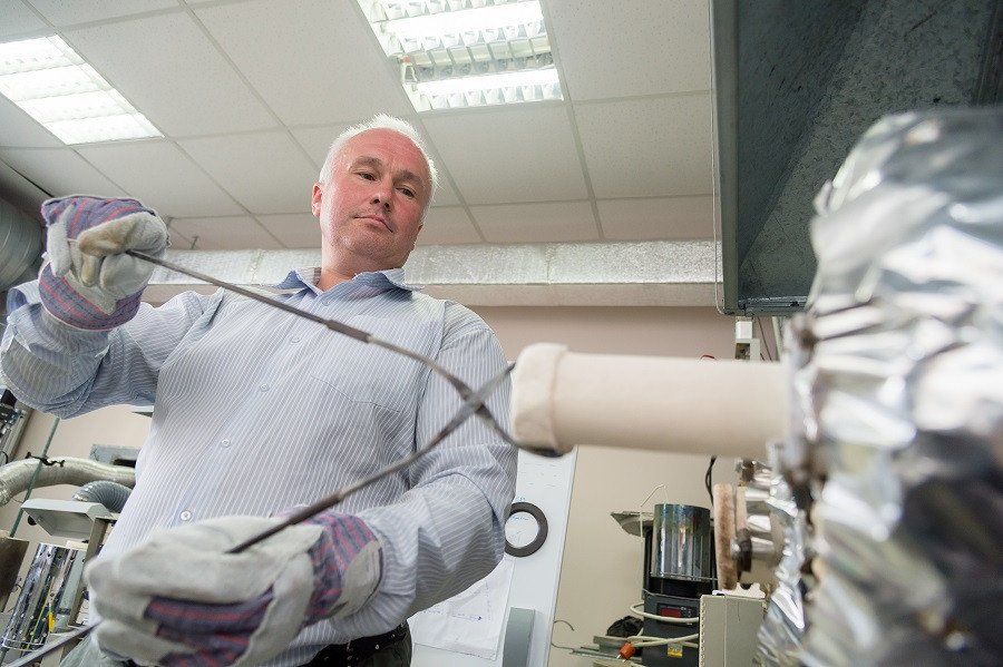 Иллюстрация: Сергей Труханов в процессе обжига металлокерамического композита. Фото: Олег Игошин