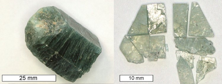Кристаллы апатита SlyudAP (слева) и его фрагментов, подготовленные для локального анализа (справа). Фото предоставлено Артемом Мальцевым